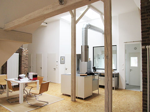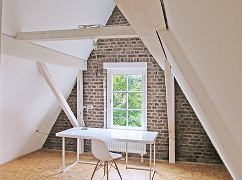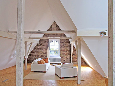 Im Zuge der Gesamtsanierung der denkmalgeschützten Villa wurde der Dachraum in ein modernes Loft verwandelt. Die historische Struktur wurde erhalten und durch gezielte Lichtführung besonders zur Wirkung gebracht. So entstand eine Wohnung mit einer Mischung aus rustikalem Charme, Eleganz und modernem Komfort. Die Backsteingiebel und –schornsteine, die Zwerggauben sowie die Dachtragstruktur wurden aufgearbeitet ohne die Spuren ihres Alters zu verstecken.